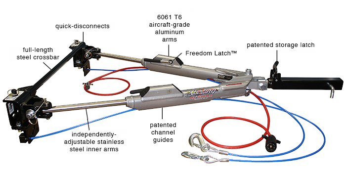 The Sterling All-Terrain was designed, tested and manufactured to the highest standards. The Sterling All-Terrain weighs just 35 pounds, yet pulls up to three tons. A unique eggshell design distributes pressure throughout the tow bar, making the Sterling All-Terrain the world’s strongest aluminum tow bar with steel and stainless steel at every critical point to further ensure superior strength and structural integrity. The Sterling All-Terrain is easy to connect, and its stainless steel inner arms telescope, center and automatically lock as you pull away. Once you’ve reached your destination, a unique storage lock secures the Sterling All-Terrain in its stored position.